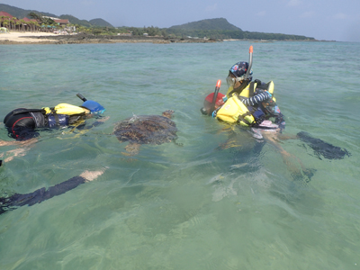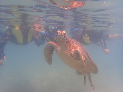 透明度の悪い中、子供たちはカメの息継ぎのタイミングでじっくり観察☆
