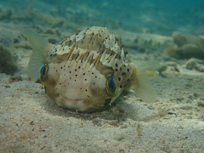 ハリセンボンもこんなかわいい表情で砂の上で寝てました。