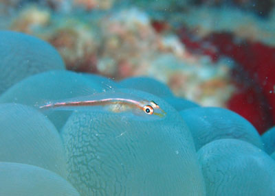 ミズタマサンゴにちょこんとのっかるアカスジカクレエビ!!