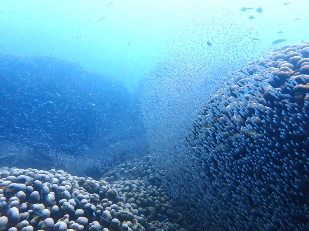 大仏サンゴは今年キビナゴの群れが居着いてくれていてサンゴを覆いつくしているんです。