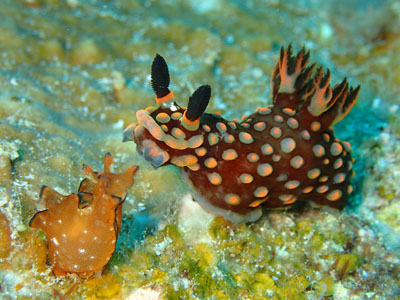 ベニゴマリュウグウウミウシとクロフチアメフラシの対峙!!