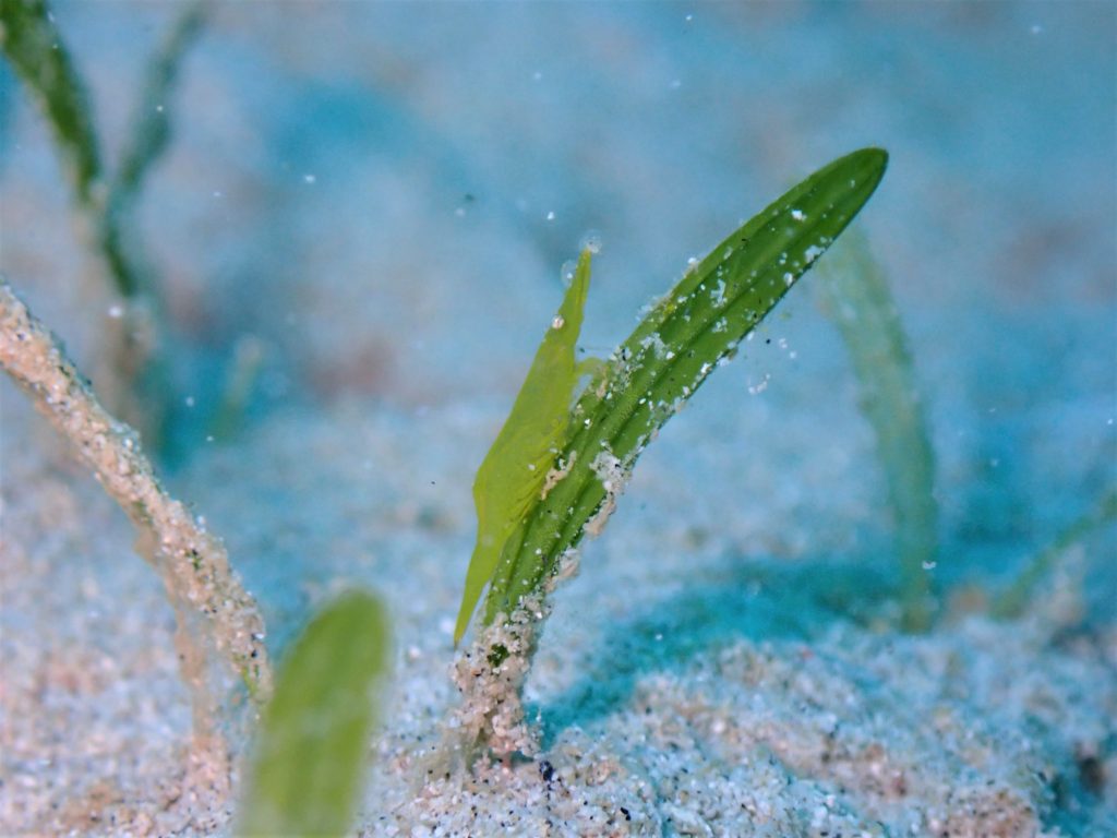 海藻に付いた海藻よりも鮮やかな緑色をしたヒラツノモエビ属の一種!!