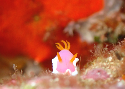ツノトゲホリミノウミウシ!スケスケの体の先端は可愛いオレンジと青のストライプ模様が入っているんです!!