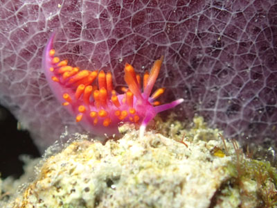 極浅の岩についていたアオミノウミウシ科の一種と思われるピンクにオレンジが入ったかわいい子!!