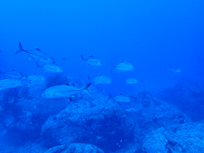 ギンガメアジとロウニンアジがネムリブカにまとわりついてました。