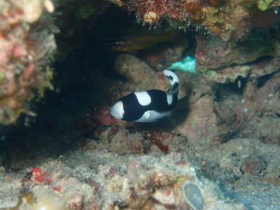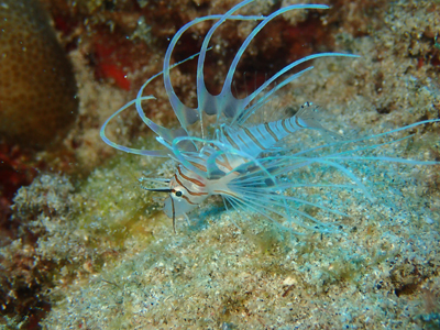 ブラックライトを当てたみたいに青色になったハナミノカサゴの赤ちゃん☆