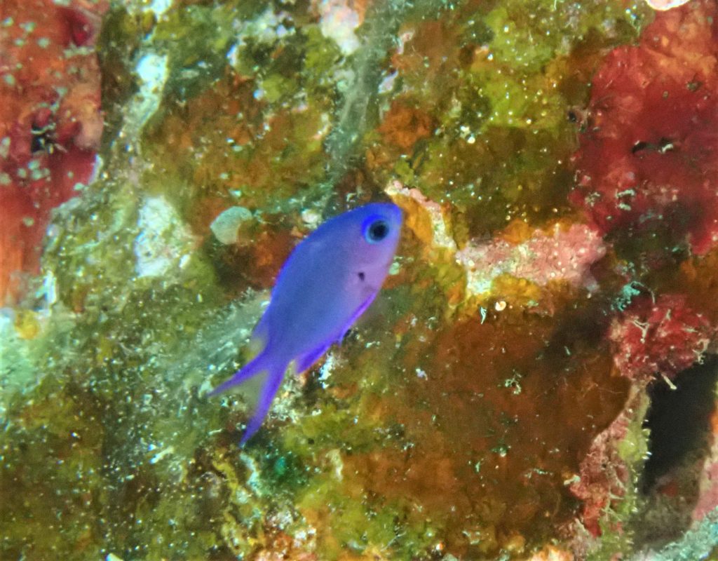 ピントがあまり合わなかったんですが、かなり深場の40m以深で見ることの多いシロボシスズメダイの幼魚!