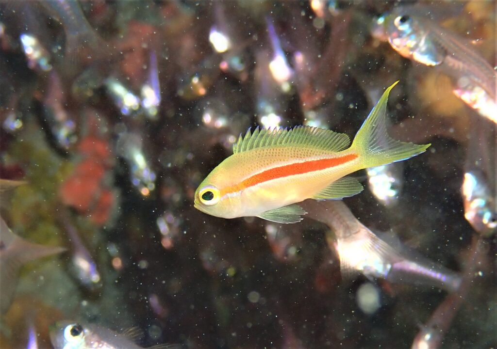 尾びれから目までまっすぐ入った綺麗な赤ラインがお美しすぎるスジハナダイ幼魚!!