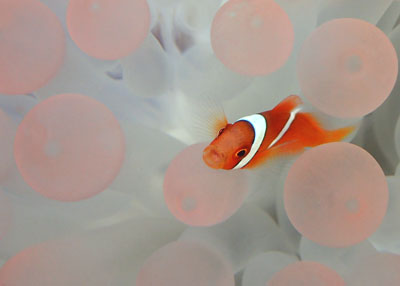 大きく開けた口がたまらないピンク色の家を持つハマクマノミの幼魚!!