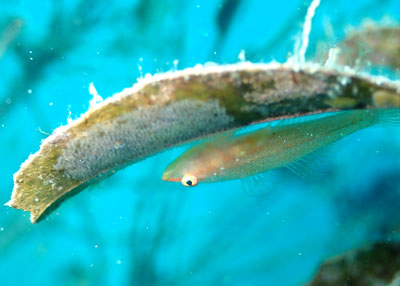 ウミショウブハゼがイカ芝の葉っぱの裏で卵を守っていました。