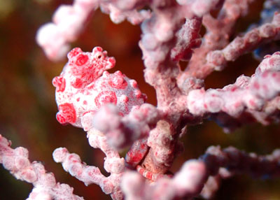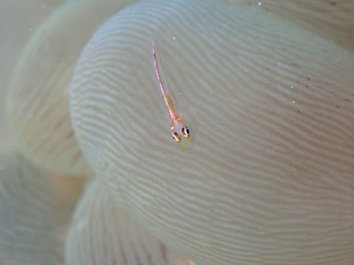 ミズタマサンゴにちょこんと乗ったアカスジウミタケハゼ!!