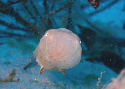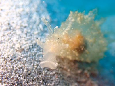 体に水を含んで膨らんだり、萎んだり、中層では水を出し入れするのでクルクルと回りながら移動する不思議なフウセンウミウシ!!