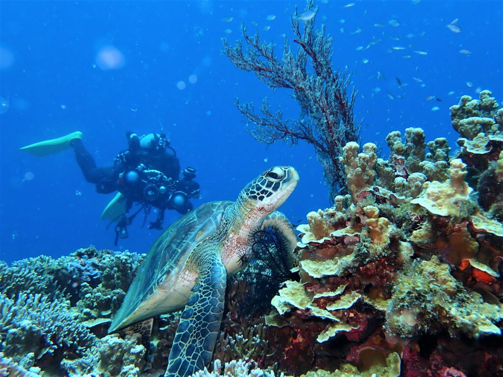最近チョイチョイここを寝床にしているアオウミガメのおチビ!!