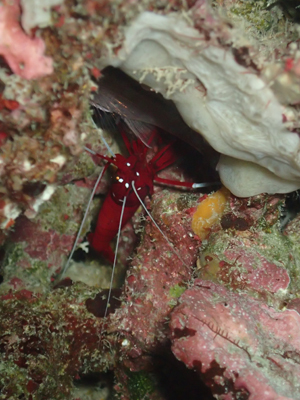 いつもの穴とは別の穴でクリーニングに勤しんでいたシロボシアカモエビ(ホワイトソックス)相変わらずシャイなくせにド派手な衣装に身を包んでいました☆