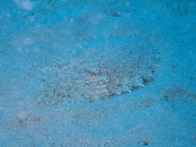 トラフコウイカだと思われるイカの仲間も砂地でべた~っと動くことなく擬態してました。