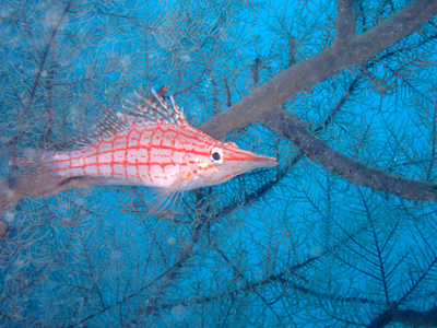 今日も覗きに行ってみると、ヤギについているアカスジカクレエビをハナミノカサゴと一緒に狙ってました☆