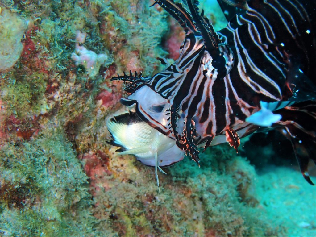 なんだか口元が変な形のハナミノカサゴだな~っと思っていたら、カガミチョウチョウウオの幼魚を捕食中でした!!