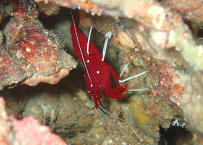 夕方になるとウツボと一緒に出てきてくれるホワイトソックス(シロボシアカモエビ)