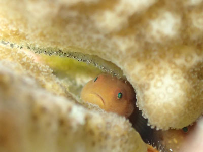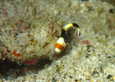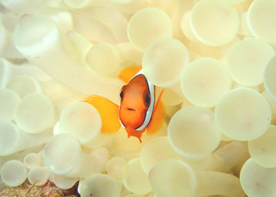 白化したイソギンチャクから顔をのぞかせるハマクマノミの幼魚!!