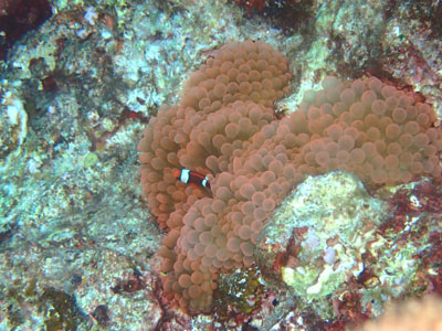 この角度から見るとハート型なオレンジイソギンチャクに居着いているハマクマノミの幼魚!!