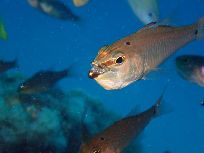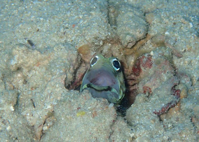 大口を開けた神経質なメガネアゴアマダイ(リングアイジョーフィッシュ)