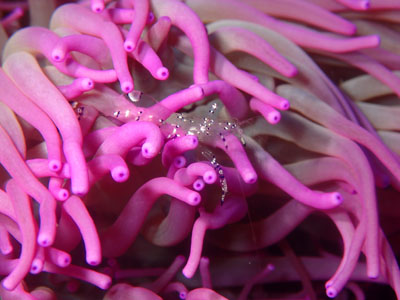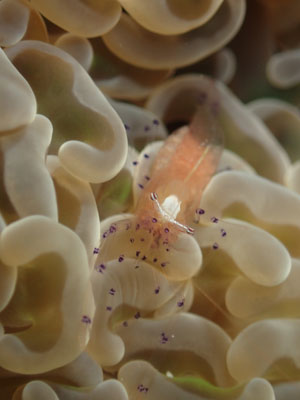 紫色のイソギンチャクに居着いているニセアカホシカクレエビも増えてました。