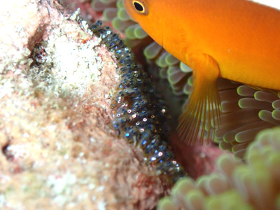 ちょいとピン甘ですが、オレンジ色のイソギンチャクに乗っかっているニセアカホシカクレエビのチビ!!