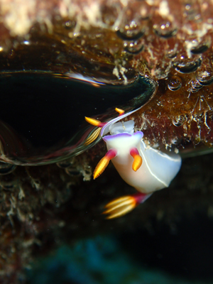 ゾウゲイロウミウシも泡の鏡で触角とニジエラが写りこんでいます。