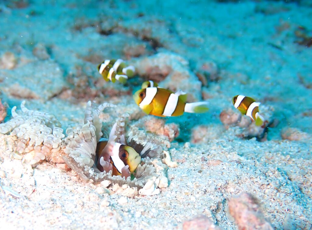 小さなイソギンチャクにたくさんのクマノミの幼魚たち、大半はイソギンチャクに入れず・・・・。