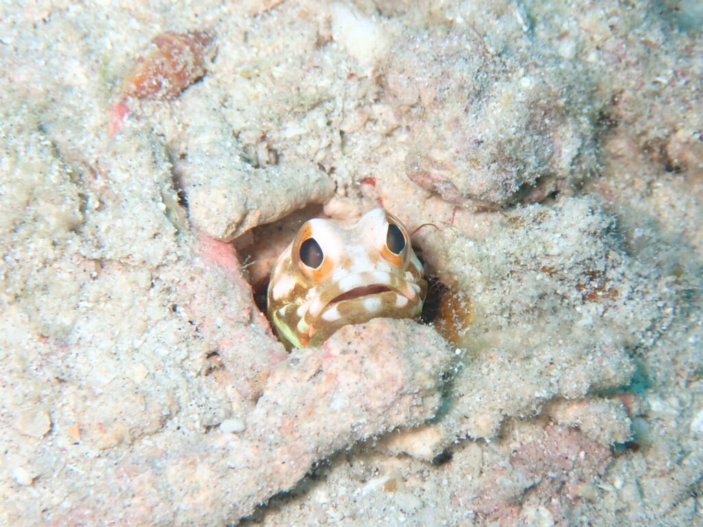 岩場の隙間からゆっくり泳いで皆さんに合わせて泳いでくれました。