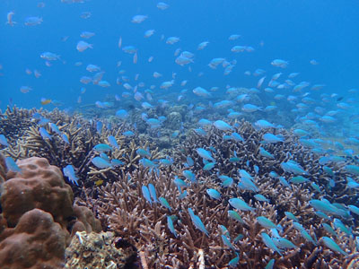サンゴの元気なこのポイントはデバスズメダイたちもめちゃくちゃきれい☆