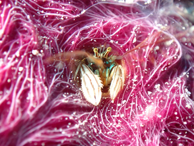 紫の海綿の中に入ったカンザシヤドカリ!!
