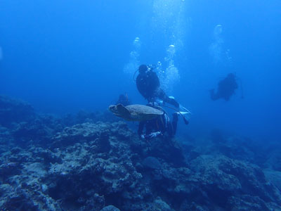 願いを込めて潜るとあまり見かけないポイントでウミガメが出てきてくれ、