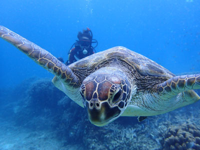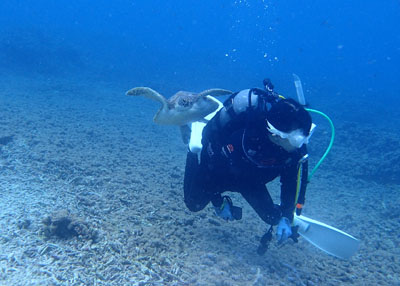 ゲストさんの後ろからもグイグイ寄ってくるアオウミガメのチビ!”!