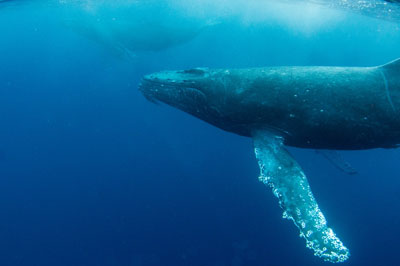ゆっくり一直線に泳いでいるクジラだったので前から入らせてもらうも、ちょいと深め・・・・。