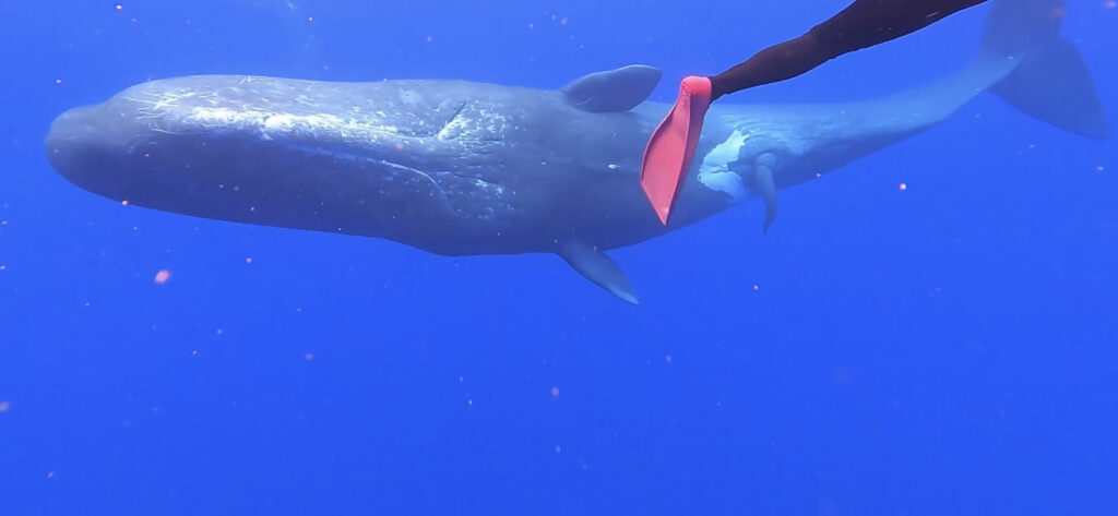 先に出ていた先輩が見つけてくれたので、他のマッコウと少し泳いだ後、寄らせてもらいました☆