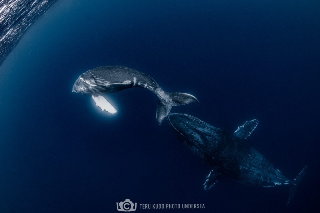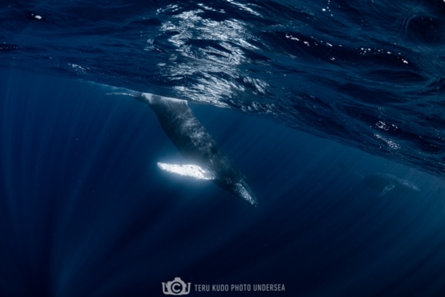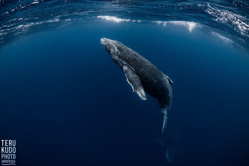 下で見守るお母さんから離れて皆さんの前に遊びにやってきてくれる子クジラ、このタイミングの子クジラは浮上の際によく見ると目を瞑っているんです♪