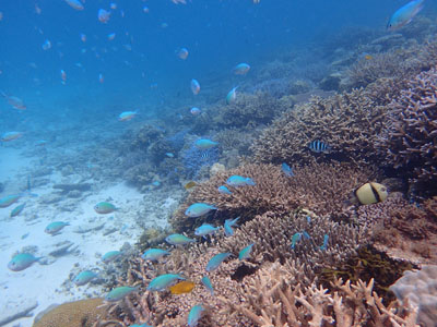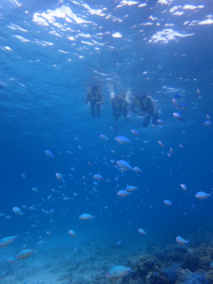 サンゴの近くでたっぷり群れるデバスズメダイの群れは水面近くまで上がってくるので