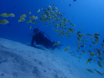 砂地の根にいる黄色いヨスジフエダイの群れは砂をとんとんすると寄ってきてくれるので、