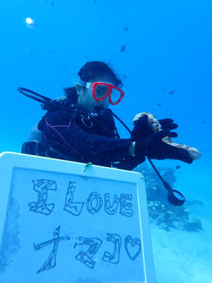 これ何??と水中で言われたのでナマコですよと書くと、自ら手の上に♪