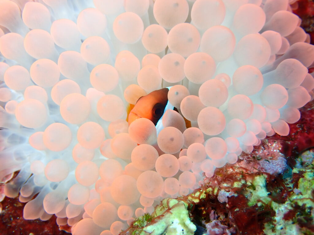白化でピンクがかったイソギンチャクに住んでいるハマクマノミの幼魚!!
