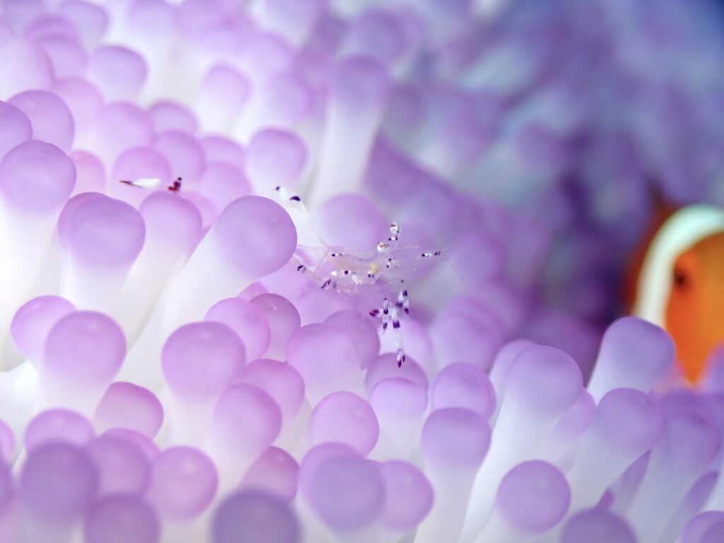 白化したカクレクマノミのイソギンチャクに乗ったニセアカホシカクレエビ!!