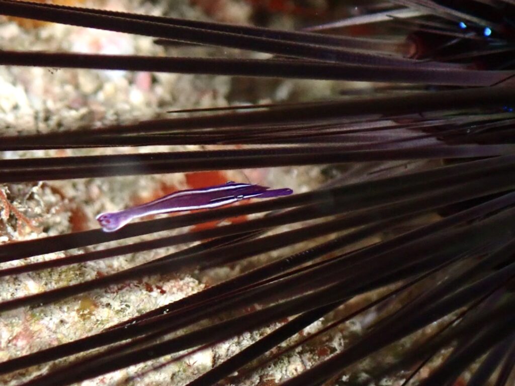 真っ黒なガンガゼのトゲの中で、ひときわお美しさを醸し出すこのエビ!!
