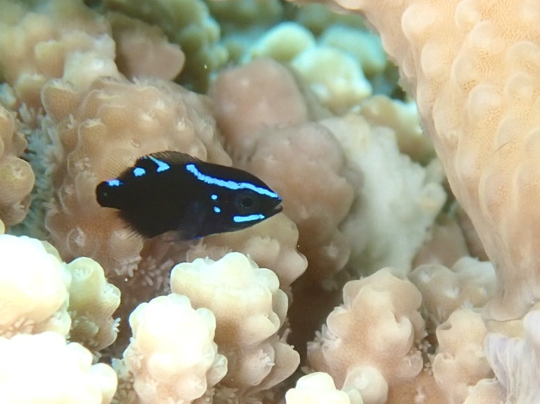 青のラインがめちゃくちゃ綺麗なアツクチスズメダイの幼魚もちょっと他よりも撮りやすい場所を発見♪