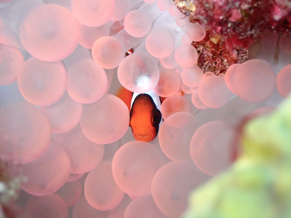 ピンクのイソギンチャクから顔だけ覗かせるハマクマノミのおチビ!!