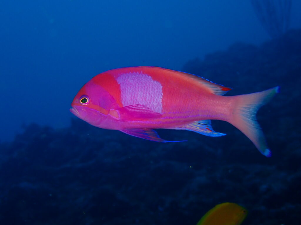 ライトが当たるとこのピンク色の体に尻ビレが虹色なんです☆