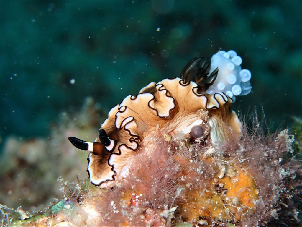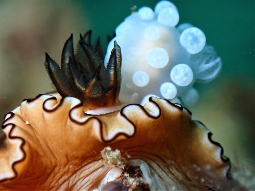 キイロウミウシに何か乗っかているなと思ったらシロボンボンウミウシが自分よりも数倍でっかいキイロウミウシにかぶりついてました(笑)