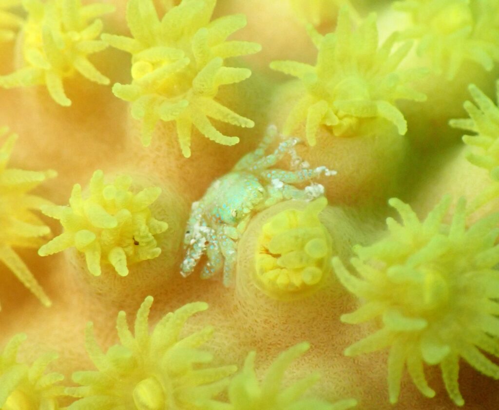 たれ目が可愛いこのカニ、サンゴのポリプが開いて可愛らしさアップです。