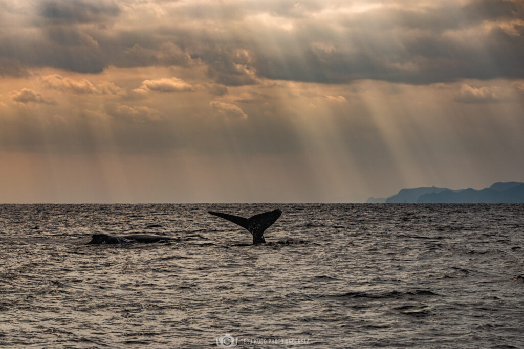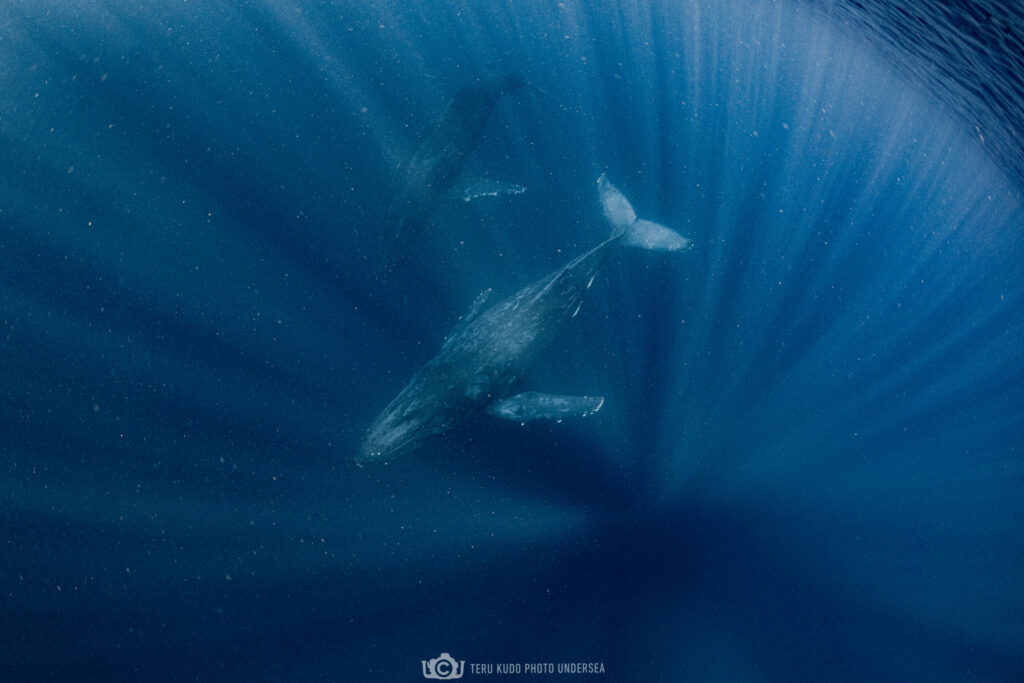 天空に続く光の柱がクジラたちを祝福しているかのようですね♪