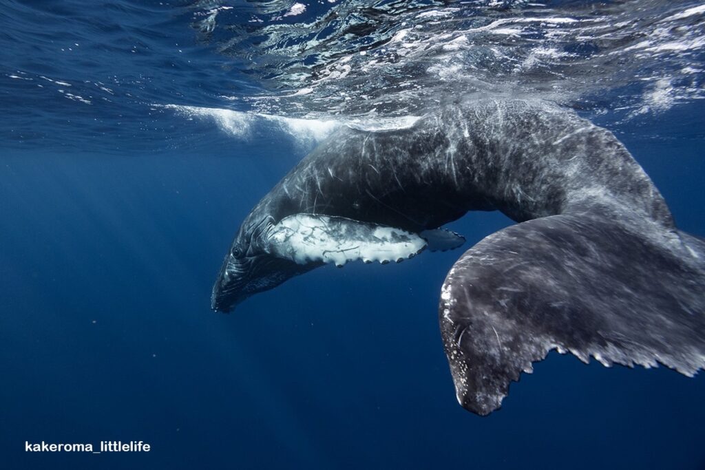 子クジラはゲストさんたちと遊びたい様で、少しずつ近づいてきて、体を回転させたり、お尻を向けたり♪